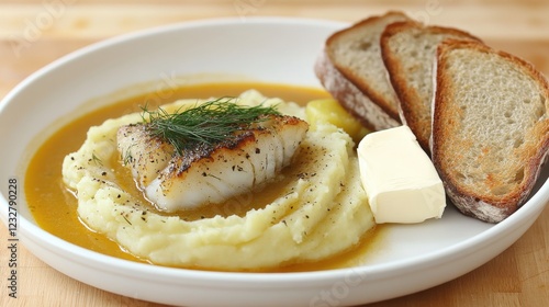 Succulent Pan-Seared Fish on Creamy Mashed Potatoes with Butter and Golden Brown Toast in White Dish - Delicious Seafood Comfort Meal Perfect for Home Dinner