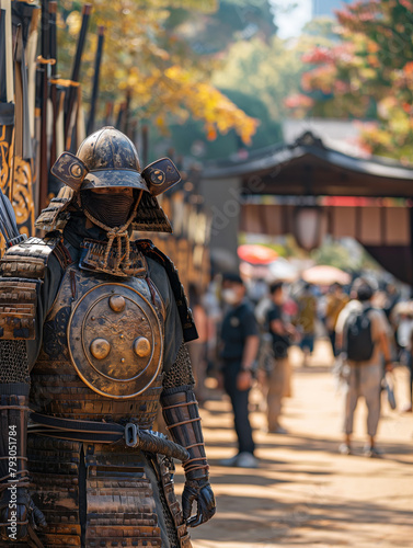 Sumida Park in Tokyo, an archer dressed in the uniform of a samurai warrior fires his arrow at a target