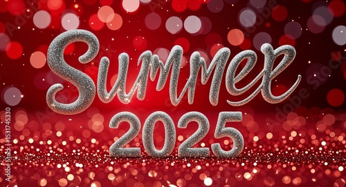 summer 2025 calligraphic lettering on red bokeh glitter festive sparkles background