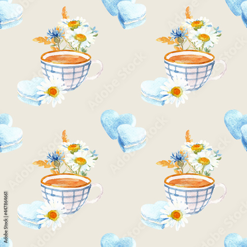 Summer dessert seamless watercolor pattern. Hand-drawn macaroons and mugs on a beige background. Suitable for backgrounds, wallpapers, textiles, fabrics