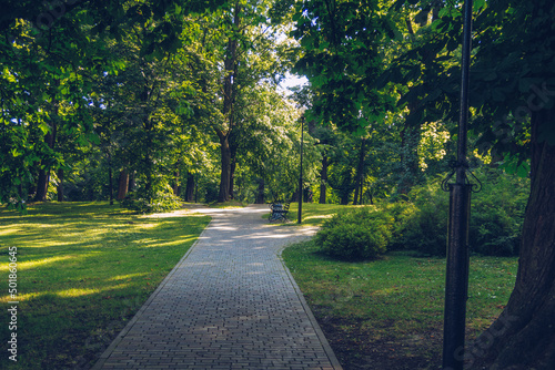 Summer park alley with trees and sunbeams going through the leaves cozy and picturesque place to relax and take a walk. Solitude atmosphere stock photography