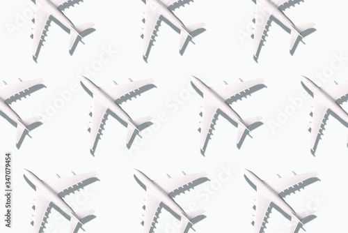 Summer pattern. Creative banner of planes on white background. Travel, vacation concept. Travel, vacation ban. Flights cancelled and resumed again. Top view. Flat lay. Minimal style design.