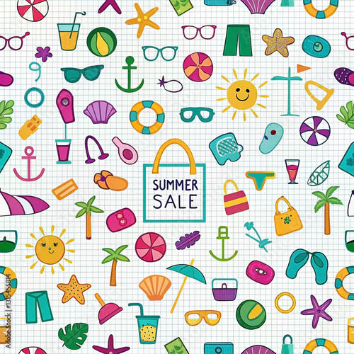 Summer sale seamless pattern with beach icons and shopping bag.