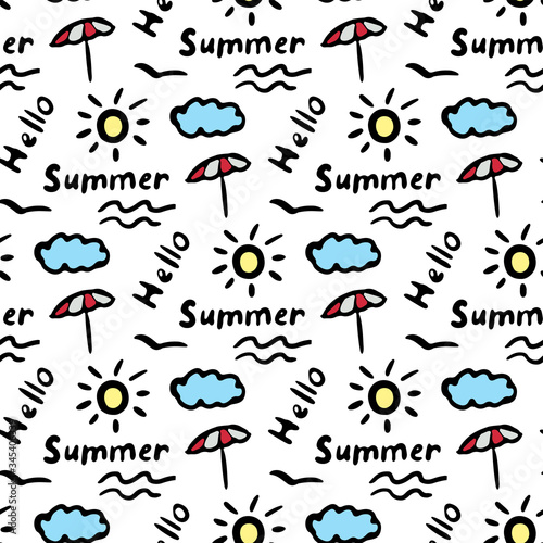 Summer seamless pattern with doodles and text. Hand drawn vector graphic illustration. Isolated object on a white background. Texture.
