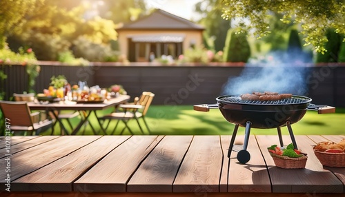 summer time party in backyard garden with grill bbq wooden table blurred background