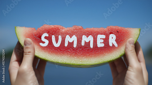 Summer Watermelon Slice: Holding a slice of watermelon in hands on blue background, emblazoned with the word 'Summer,' symbolizing the quintessential essence of summer season.