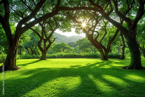 Sun Shining Through Trees in a Lush Green Forest