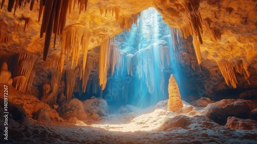 Sunbeams pierce a cave's inner sanctum, illuminating stalactites and formations