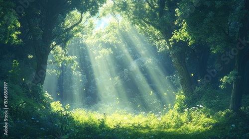 Sunbeams pierce lush forest