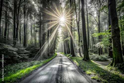 Sunbeams Through Forest Canopy on Road