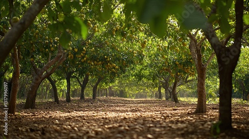 Sun-Drenched Orchard, Golden Pears Hanging on Trees in Serene Sunlight