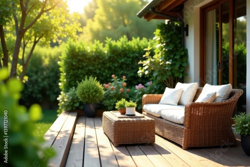 Sun-drenched rattan patio set on wood deck, lush garden , patio decor, sunshine, summer
