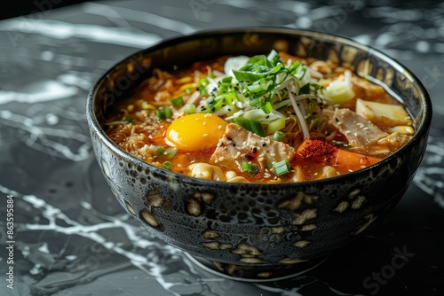 Sundubu jjigae with tofu, green onion, and kimchi in a clay pot. Korean food