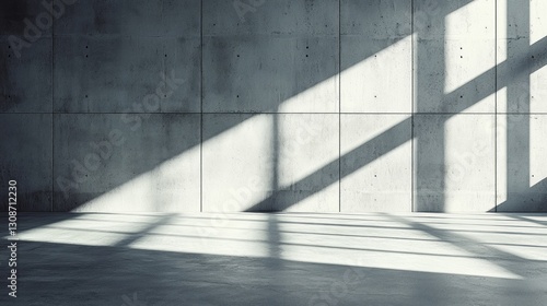 Sunlight dramatically casts window shadows across a modern concrete space