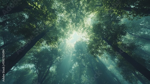 Sunlight filtering through lush green forest canopy with majestic tall trees