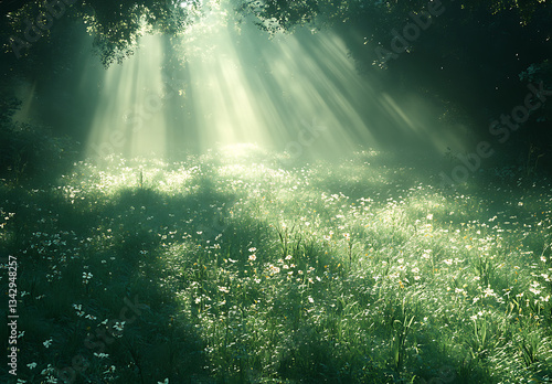 Sunlight Through Trees Illuminating a Misty Wildflower Field