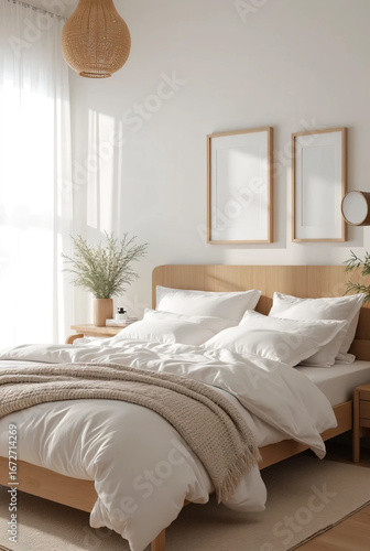 Sunlit bedroom with minimalist interior design featuring white bedding, wooden headboard, woven pendant lamp, indoor plants, and decorative frames on the wall. Calm and natural ambiance.