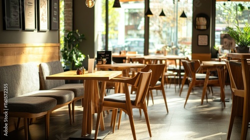 Sunlit cafe interior with wooden tables, chairs, and booths.