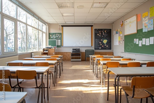 Sunlit classroom interior featuring empty desks and learning environment details