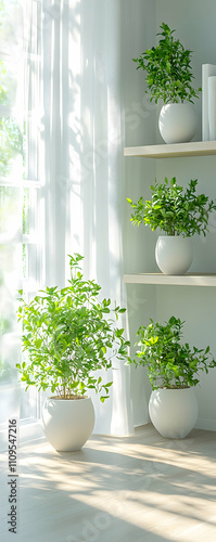 Sunlit indoor plants on a shelf near a window.