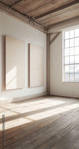 Sunlit Room Interior Wooden Floor Exposed Beams Blank Canvases Sunlight
