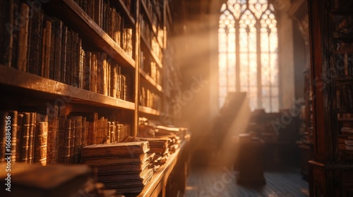 Sunlit Sanctuary: A historic library, bathed in golden light streaming through a gothic window, reveals rows of ancient books.
