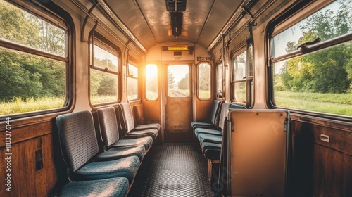Sunlit train compartment with empty seats and scenic countryside visible through the window, symbolizing solo exploration.