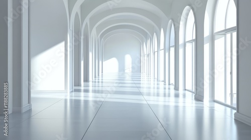 Sunlit white arched hallway with windows.