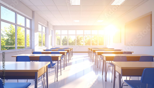 Sunny Classroom with School Desks, and Education.