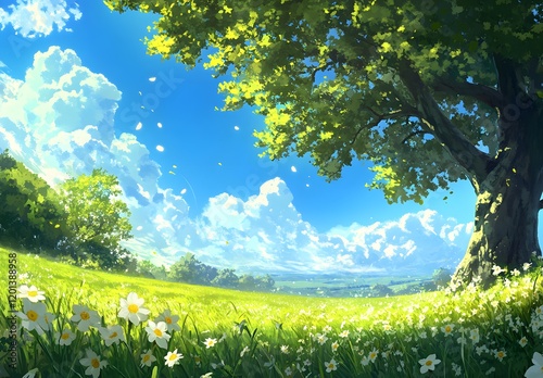 Sunny Day Field Of Daisies Underneath A Large Tree