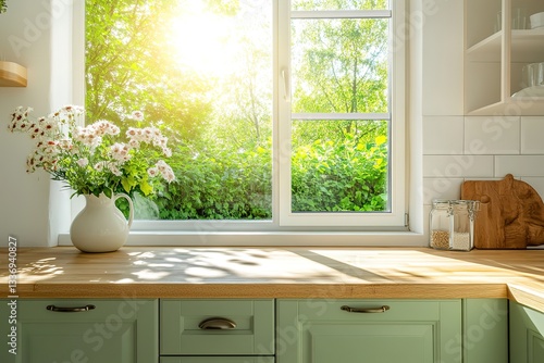 Sunny Kitchen Windowsill with Flowers, Wooden Counter, and Green Cabinets