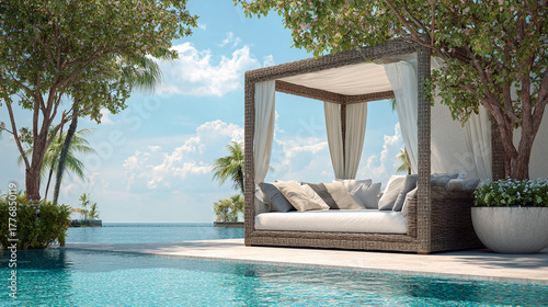 Sunny poolside lounge area surrounded by greenery