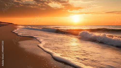 Sunny Seaside Escape: Golden Sand Beach with Calm Waves and Fiery Sunset, a Tranquil Coastal Scene for Travel Imagery