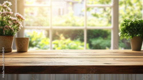 Sunny Windowsill with Plants and Wooden Tabletop