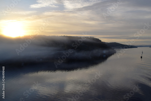 Sunrise and fog in the fjord. Photo taken just outside Oslo, Norway