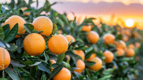 Sunrise over Orange Plantation: expanse of orange trees stretching out to the horizon, bathed in the soft golden light of the rising sun. The oranges on the trees glisten with dew.