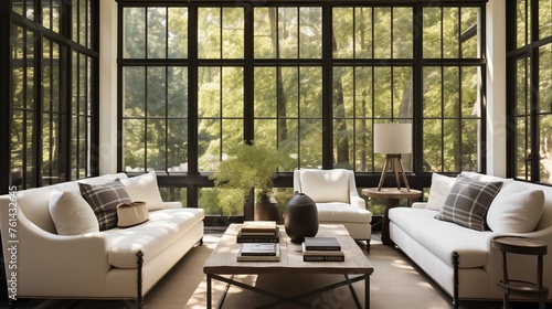 Sunroom with off-white plush upholstery and black metal framed windows.