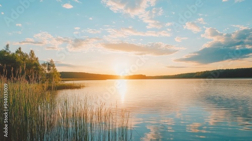 sunset at coast of the lake. Nature landscape. Nature in northern Europe. reflection, blue sky and yellow sunlight. landscape during sunset.