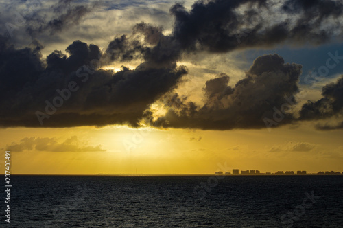 Sunset at sea off the coast on Miami FL USA with dramatic cloud cover and yellow tones