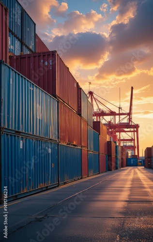 Sunset at Shipping Port Rows of Cargo Containers Crane Global Trade Logistics