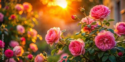Sunset Backlit Pink Rose Bush - Vibrant Floral Photography