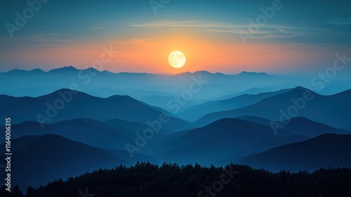 Sunset moonrise over layered blue mountains.