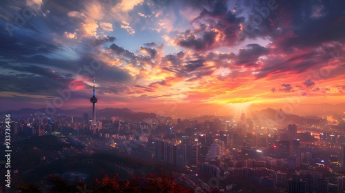 Sunset of Seoul City and Seoul Tower South Korea.