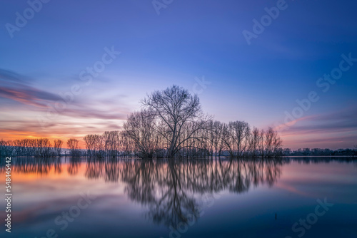 Sunset on the shore of a natural natural landscape lake in northern Europe. Reflections, blue sky and yellow sun. Landscape during sunset.