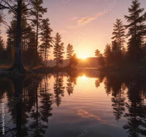 Sunset over a lake with trees reflected in calm water, scenery, sun
