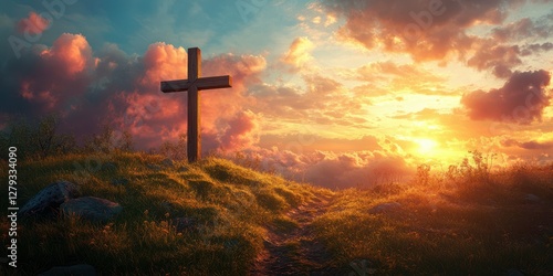 Sunset over a peaceful meadow with a wooden cross on a hilltop