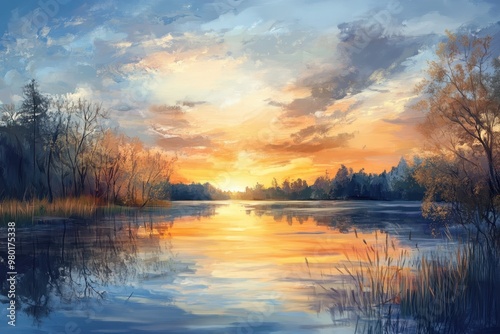 Sunset Over a Serene Lake With Silhouetted Trees