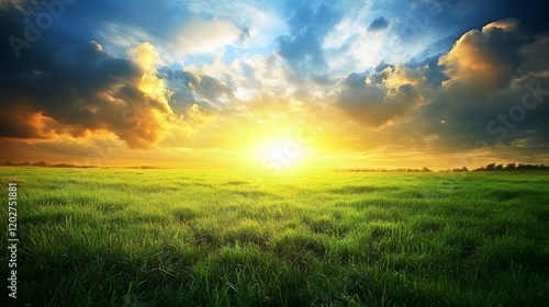 Sunset over a vast green grassy field