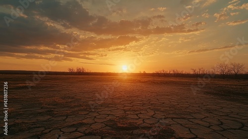 Sunset over cracked earth, barren landscape