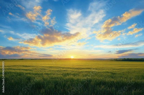 Sunset over expansive green field with scattered clouds in a bright blue sky creating a peaceful and serene atmosphere